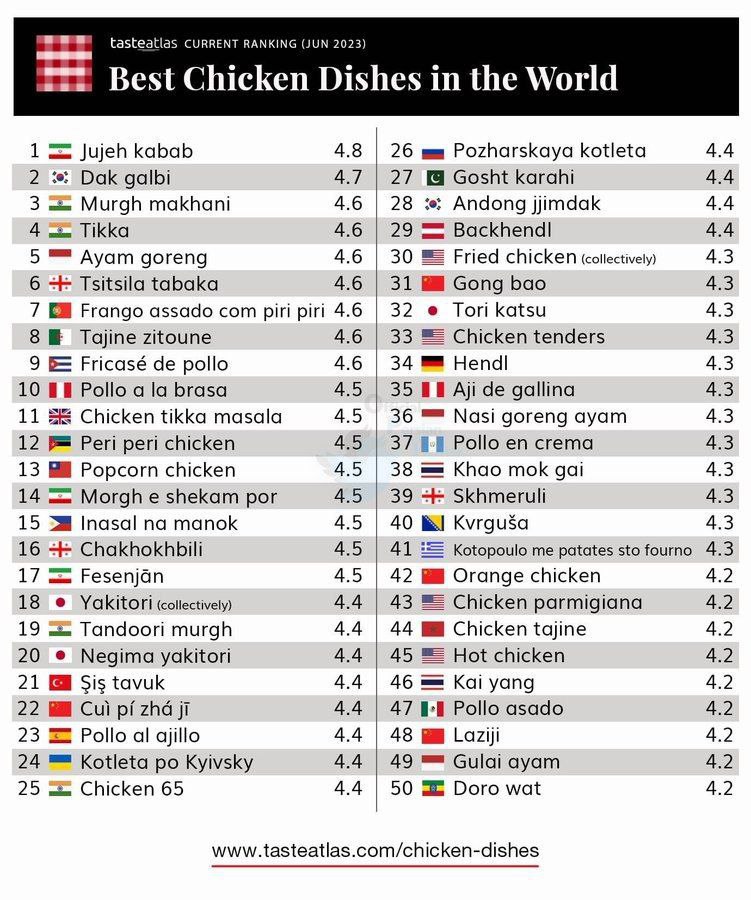 «جوجهکباب» در جایگاه نخست، «مرغ شکمپر» و «فسنجان» بهترتیب در جایگاه چهارده و هفدهم برترین غذا با پایهی مرغ در وبسایت TasteAtlas قرار گرفتند.