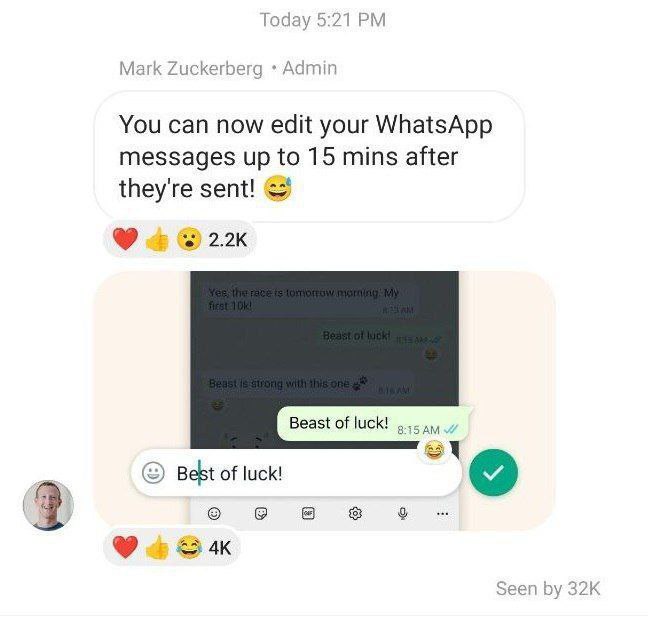 🔹 مارک زاکربرگ، مدیرعامل متا در کانال متا در اینستاگرام رسماً از انتشار قابلیت ویرایش پیامهای واتساپ خبر داد. به گفته زاکربرگ، کاربران حالا میتوانند تا ۱۵ دقیقه پس از ارسال پیامها، آنها را ویرایش کنند.