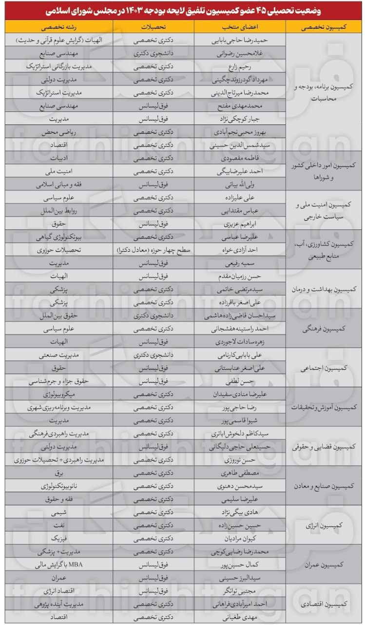 🔹 در کمیسیون تلفیق بودجه ١۴٠٣، سه اقتصادخوانده حضور دارند. به عبارتی، از ۴۵ عضو کمیسیون تلفیق، ۶/٧ درصد از آنها فارغالتحصیل علوم اقتصادی هستند.