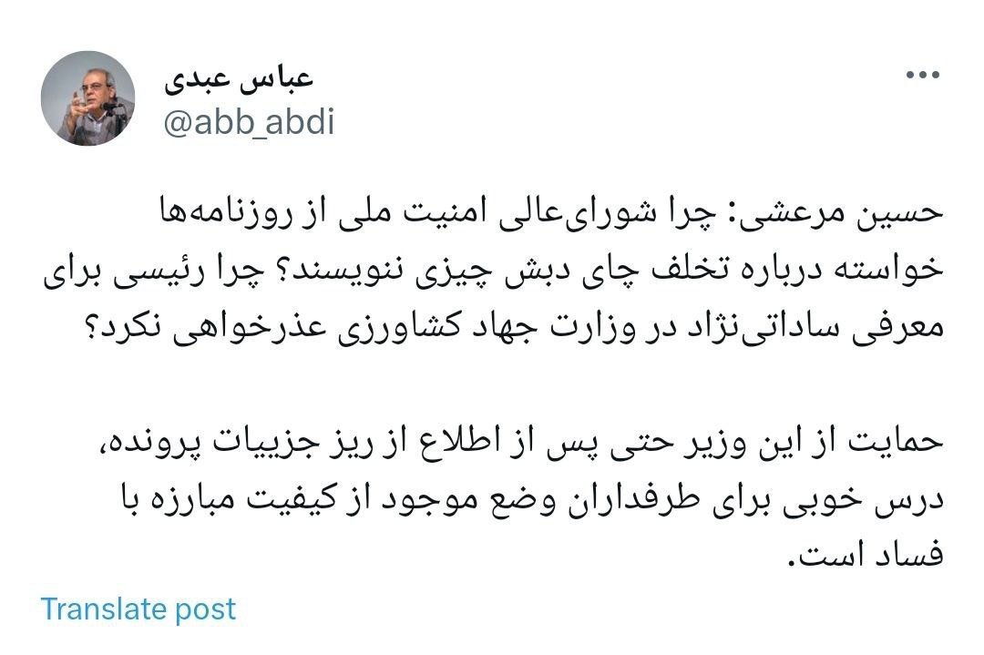 🔹 عباس عبدی، تحلیلگر مسائل سیاسی: حمایت از این وزیر حتی پس از اطلاع از ریز جزییات پرونده، درس خوبی برای طرفداران وضع موجود از کیفیت مبارزه با فساد است.