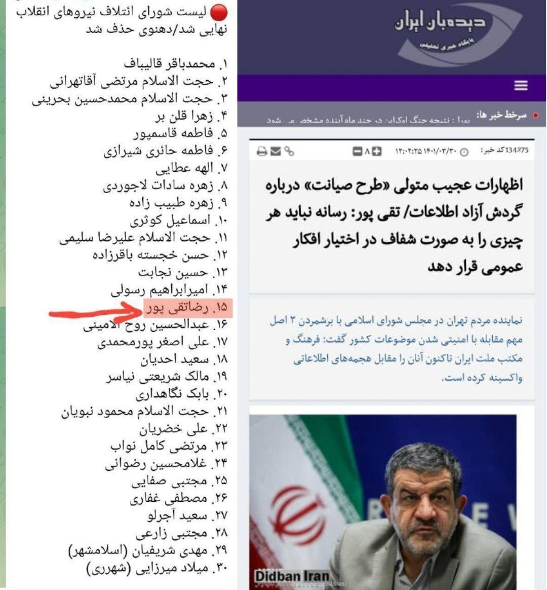 🔹رحمتالله بیگدلی در توییتی نوشت: رضا تقیپور متولی اصلیِ «طرحِ ضداینترنت صیانت» از افراد تازهوارد به لیست شانا است.