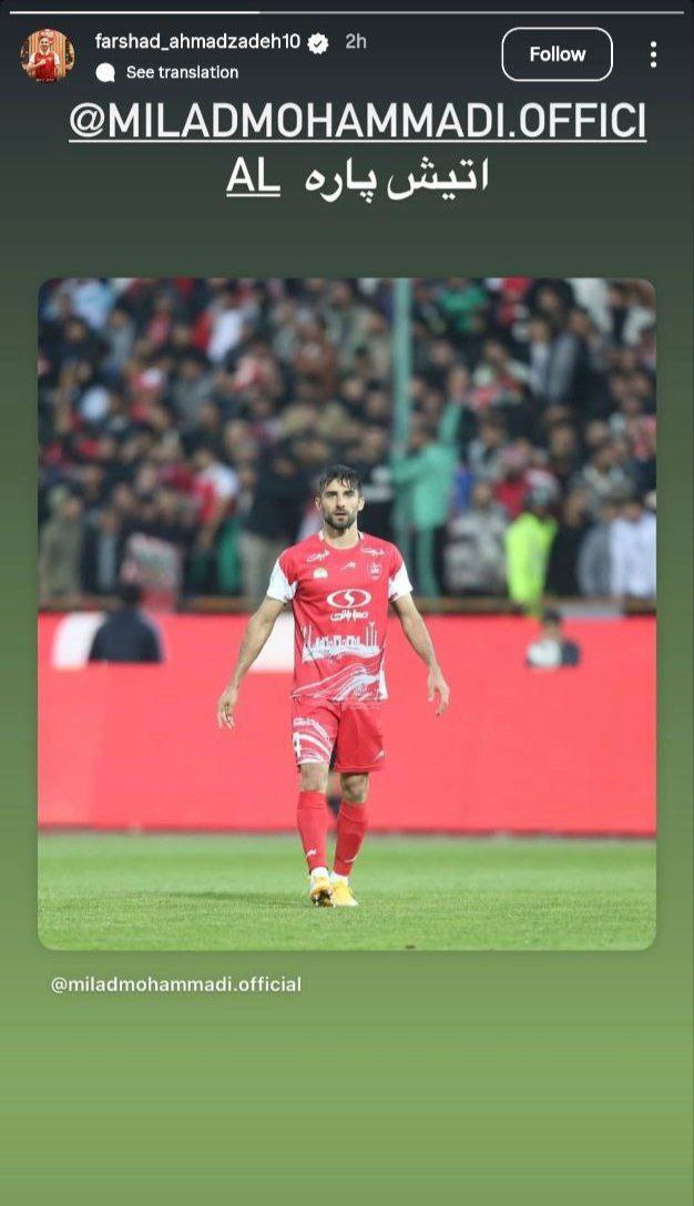 شب گذشته تیم ملی ایران در فینال تورنمنت چهارجانبه العین مقابل ازبکستان صفآرایی کرد و در پایان در ضربات پنالتی شکست خورد. پنالتی پنجم تیم ملی که منجر به باخت شد را میلاد محمدی از دست داد. انتخاب میلاد محمدی بهعنوان زننده ضربه حساس پنجم تعجب بسیاری از دنبالکنندگان را جلب کرد. فرشاد احمدزاده، وینگر تیم پرسپولیس و همتیمی میلاد محمدی امروز با انتشار یک استوری از محمدی حمایت کرد.