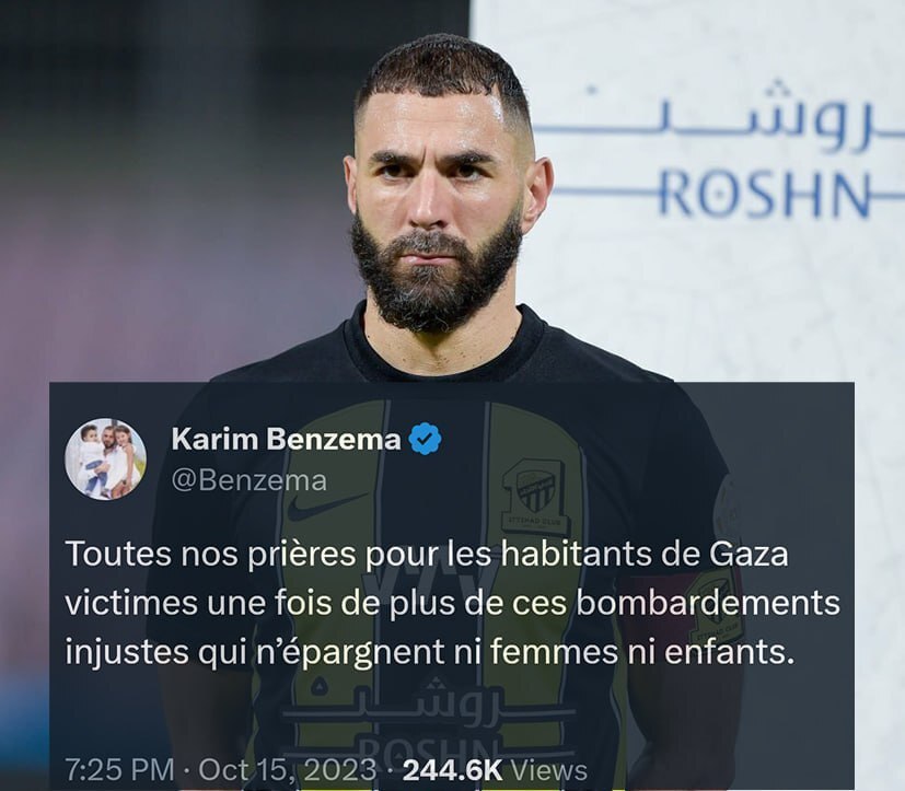 ستاره فرانسوی الاتحاد عربستان در صفحه توئیتر خود نوشت: تمام دعای ما برای ساکنان غزه است که بار دیگر قربانی این بمباران ناعادلانه میشوند و به زنان و کودکان رحم نمیکند.