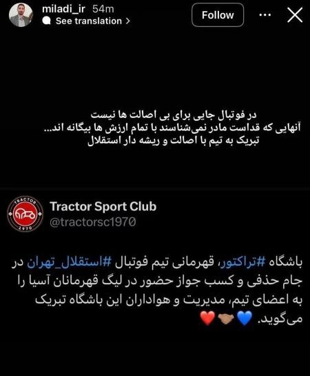 مشاور فرهنگی باشگاه تراکتور قهرمانی استقلال در جام حذفی را تبریک گفت.