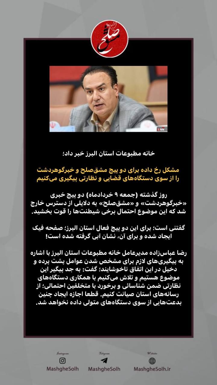 خانه مطبوعات استان البرز خبر داد؛ مشکل رخ داده برای دو پیج مشقصلح و خبرگوهردشت را از سوی دستگاههای نظارتی و قضایی پیگیری میکنیم