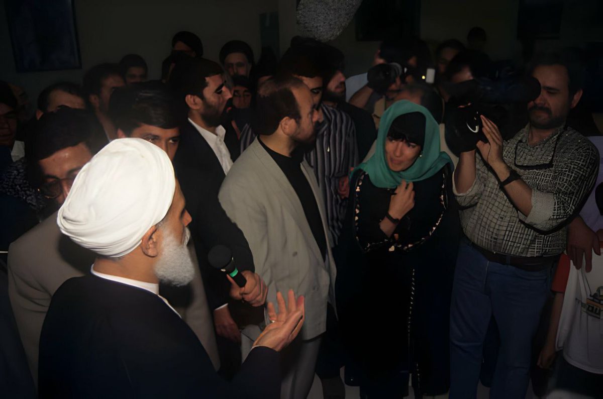 خبرنگار مشهور زن در حال مصاحبه با ناطق نوری در روز انتخابات ۷۶
