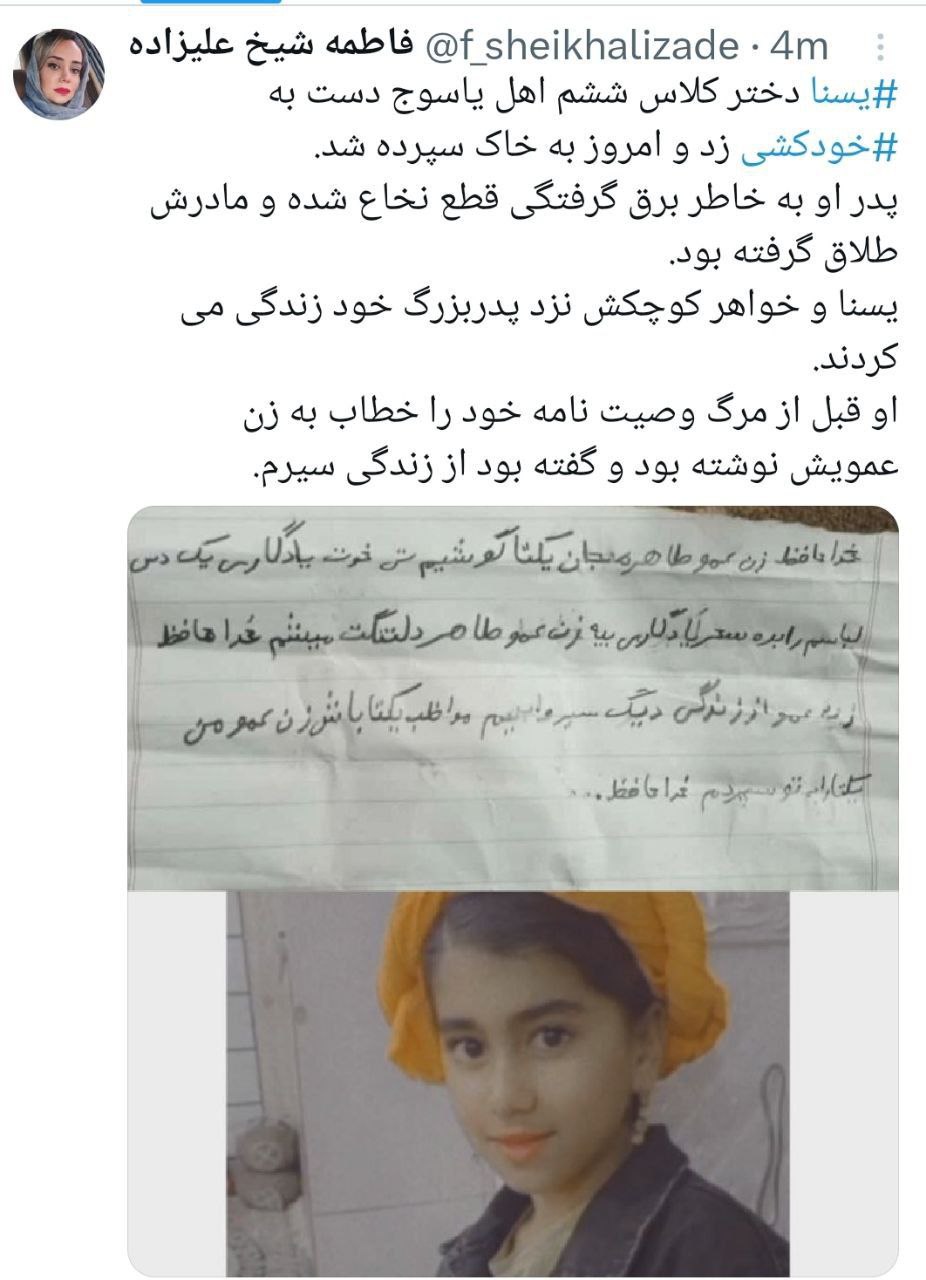 خودکشی دختر یاسوجی/او کلاس ششم درس می خواند