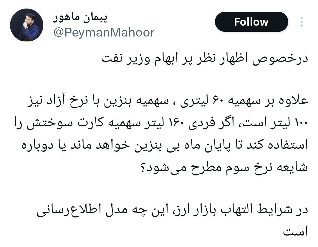 🔹علاوه بر سهمیه ۶۰ لیتری ، سهمیه بنزین با نرخ آزاد نیز ۱۰۰ لیتر است، اگر فردی ۱۶۰ لیتر سهمیه کارت سوختش را استفاده کند تا پایان ماه بی بنزین خواهد ماند یا دوباره شایعه نرخ سوم مطرح میشود؟