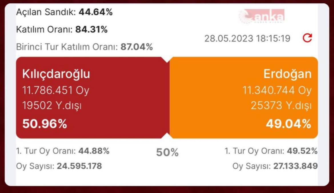 🔹در درصدهای ارائه شده توسط شبکه هالک، کیلیچداراوغلو ۵۰/۹۶ درصد رای کسب کرده و اردوغان ۴۹/۰۴ درصد آرا را از آن خود کرده است.