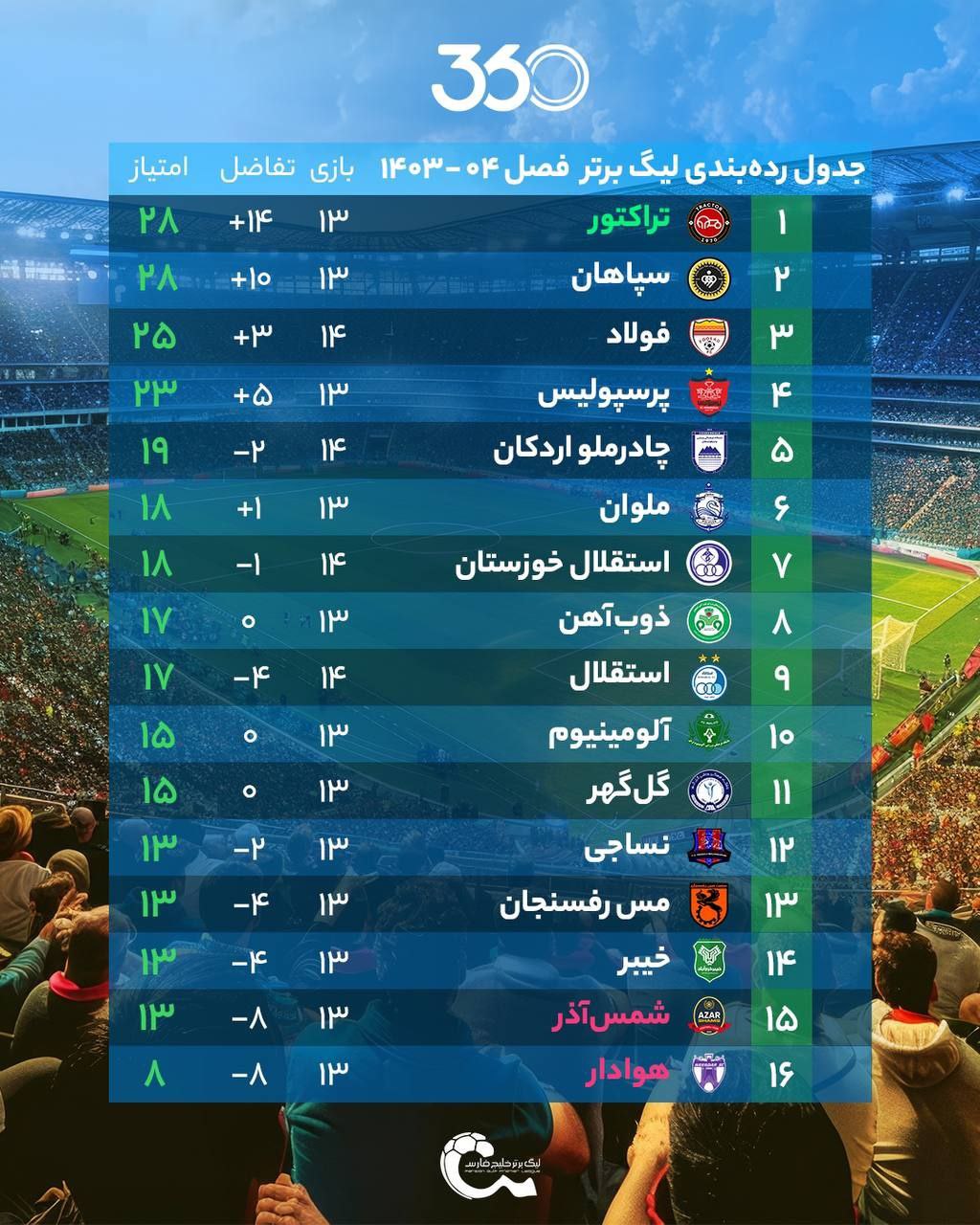 در پایان روز اول از هفته ۱۴ 🔹 جدول ردهبندی لیگ برتر