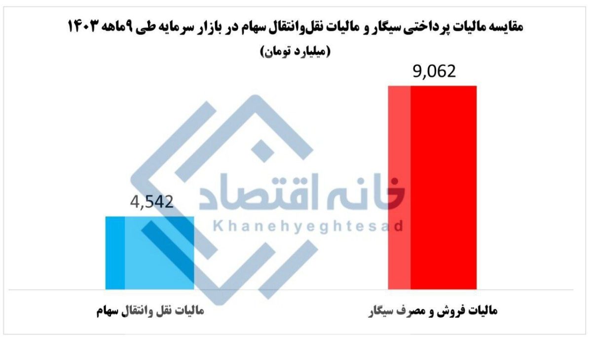 🔹بر اساس محاسبات «خانه اقتصاد»، درآمد مالیاتی دولت از فروش و مصرف سیگار در ۹ ماهه امسال حدود ۹ هزار و ۶۲ میلیارد تومان بوده که حدود ۲ برابر مالیات ۴ هزار و ۵۴۲ میلیارد تومانی نقلوانتقال سهام در بورس طی همین مدت است.