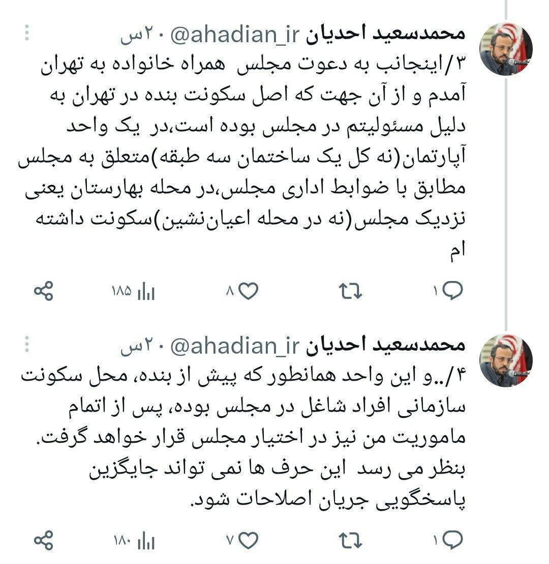🔹هفته گذشته کاربری در توئیتر با انتشار تصویر خانه ای نوشت: دستیار قالیباف یک خانه سه طبقه لاکچری را در اختیار گرفته است اما احدیان در واکنش به این ادعا، با انتشار توییتی اعلام کرد که خانهای که در آن سکونت دارد یک واحد از یک ساختمان سازمانی است که از قدیم در اختیار شاغلین مجلس قرار میگرفته است و اکنون نیز بر حسب مسئولیتی که در مجلس دارد این واحد در اختیار او بوده و بعد از پایان مسئولیت نیز تحویل مجلس خواهد شد.