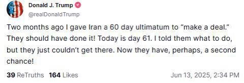 دونالد ترامپ، رئیسجمهور آمریکا در تاریخ ۱۲ آوریل امسال مهلتی ۶۰ روزه به ایران داده بود که امروز دقیقا ۶۱ روز از آن تاریخ گذشته است. موضوعی که نشان میدهد نتانیاهو دقیقا بامداد روز بعد از پایان مهلت تهدیدآمیز رئیسجمهور آمریکا حمله به خاک کشورمان را آغاز کرده است. همچنین همشهری نوشت: ترامپ: «امروز روز ۶۱ است. به آنها گفتم چه کنند، اما نتوانستند. شاید حالا یک شانس دوم داشته باشند!»