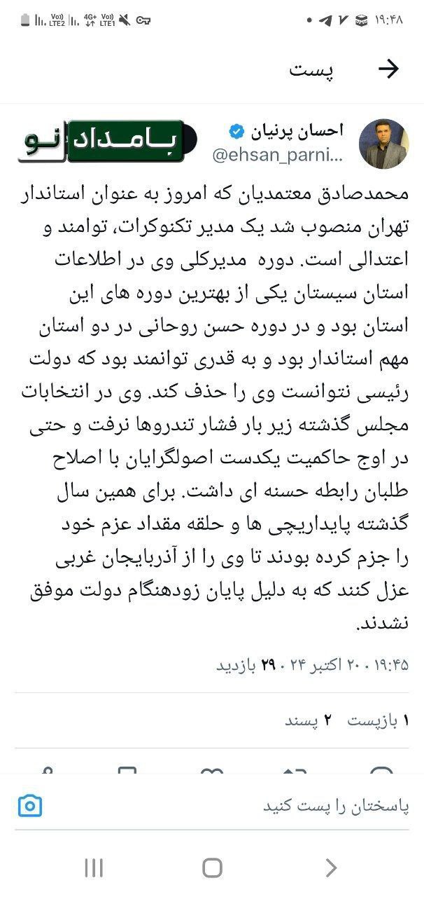 🔹احسان پرنیان که در سال گذشته با مصوبه شورای تامین استان تهران و با هدایت معاون رئیس جمهور سابق راهی دادگاه شده بود درباره انتصاب معتمدیان به عنوان استاندار نوشت که وی مدیری تکنوکرات،توانمند و اعتدالی است
