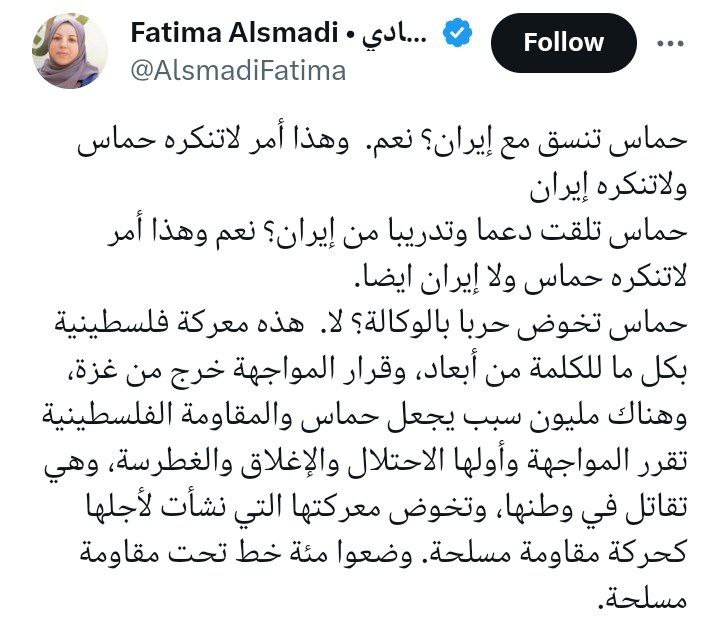 دكتر فاطمه الصمادی پژوهشگر ارشد در مركز مطالعات الجزيره: آيا حماس در حال جنگ نیابتی است؟ خير، این نبرد تمام عيار فلسطینی ها است و میلیون ها دلیل براى آن وجود دارد.