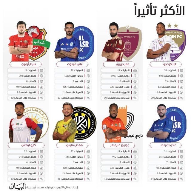 روزنامه البیان در گزارشی به تاثیرگذارترین بازیکنان فصل جاری لیگ امارات پرداخت. در این فهرست هشتنفره نام دو بازیکن ایرانی هم دیده میشود که عملکرد بسیار خوبی در ترکیب تیمهایشان داشتهاند.
