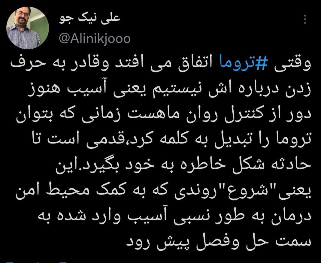 دکتر علی نیک جو متخصص روان پزشکی و روان درمانگر تحلیلی: 🔹 وقتی تروما اتفاق می افتد وقادر به حرف زدن درباره اش نیستیم یعنی آسیب وارد شده هنوز دور از کنترل ذهنی ما قرار دارد.