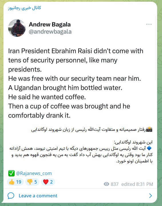 🔹آیت الله رئیسی مثل رییس جمهورهای دیگه با تیم امنیتی نیومد، همش آزادانه کنار ما بود وقتی یه اوگاندایی بهش آب داد گفت به من یه فنجون قهوه هم بدید و با اطمینان اونو خورد.