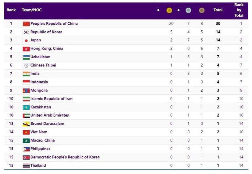 🔹کاروان ورزشی چین در پایان روز نخست بازیهای آسیایی هانگژو با ۲۰ مدال طلا، ۷ نقره و ۳ برنز (۳۰ مدال) در جایگاه نخست ردهبندی مدالی قرار گرفت.
