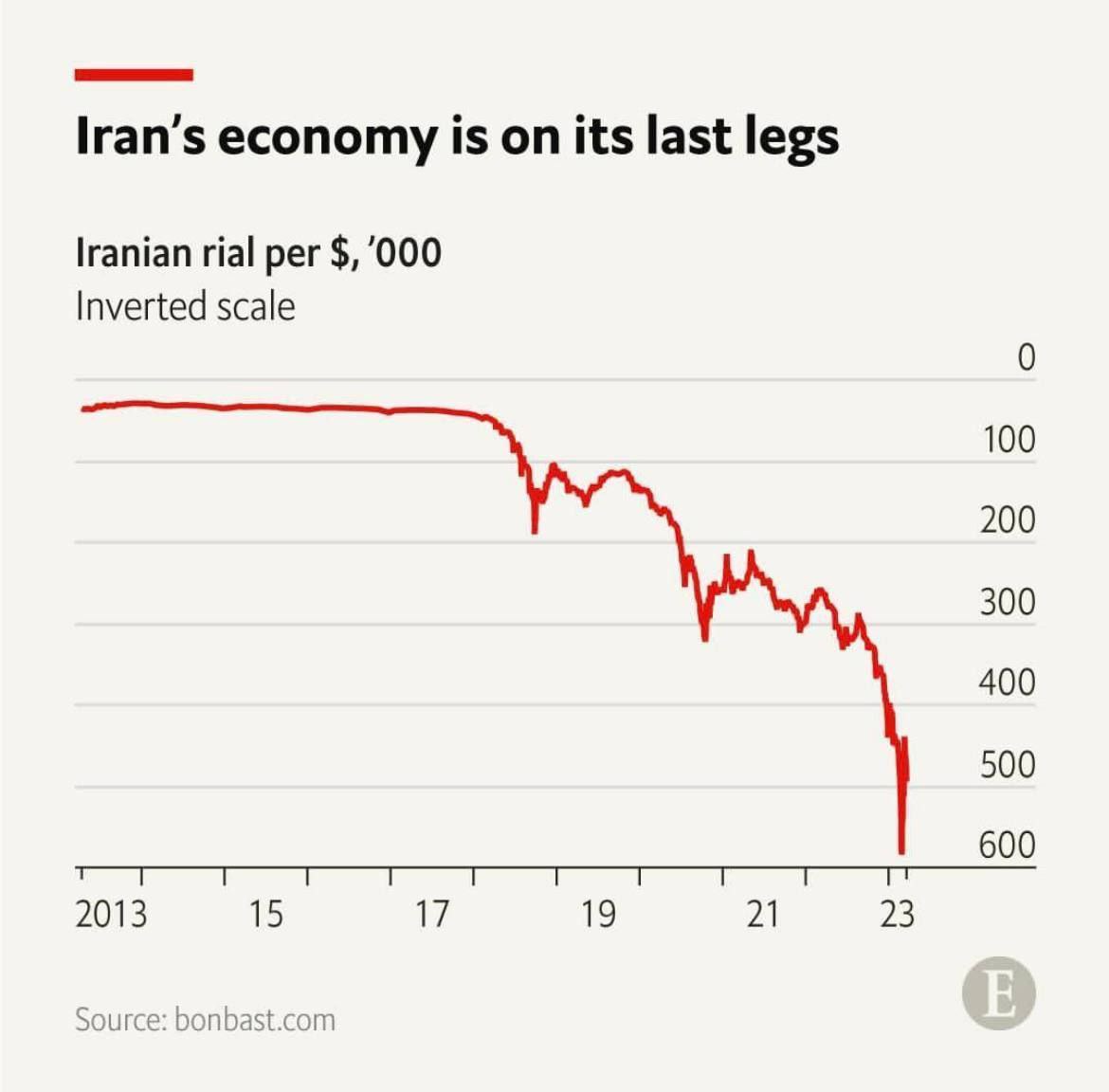 🔹نمودار منتشر شده توسط اکونومیست نشان میدهد که در فوریه ۲۰۲۳، ریال ایران، به پایینترین سطح تاریخی خود یعنی ۵۸۰ هزار به ازای هر دلار سقوط کرد و ریال را ۵۵ درصد ضعیفتر از یک سال قبل و ۹۴ درصد ضعیفتر در طول یک دهه نشان میدهد.