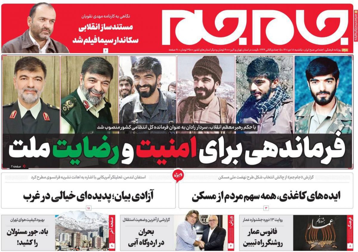 روزنامه جام جم رسانه صداوسیما در تیتر نخست خود به استقبال انتصاب فرمانده جدید نیروی انتظامی رفته است.