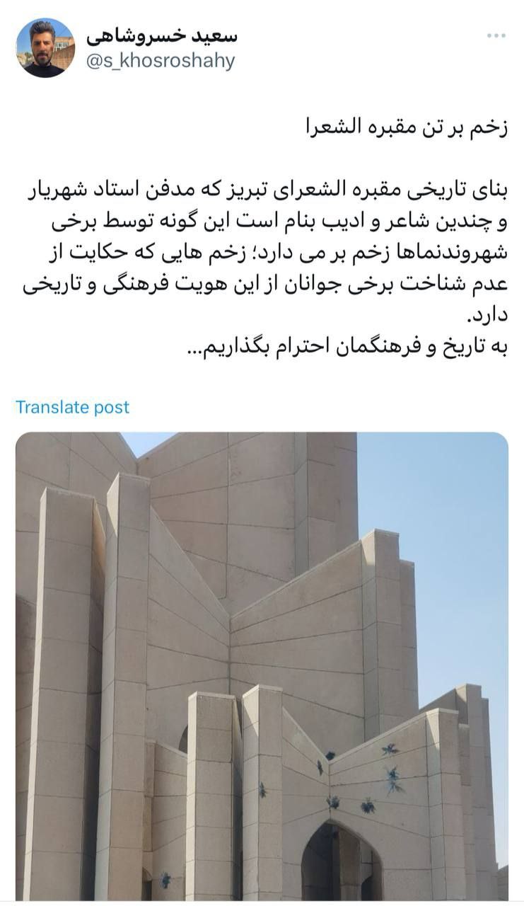 🔹بنای تاریخی مقبره الشعرای تبریز که مدفن استاد شهریار و چندین شاعر و ادیب بنام است این گونه توسط برخی شهروندنماها زخم بر می دارد؛ زخم هایی که حکایت از عدم شناخت برخی جوانان از این هویت فرهنگی و تاریخی دارد.