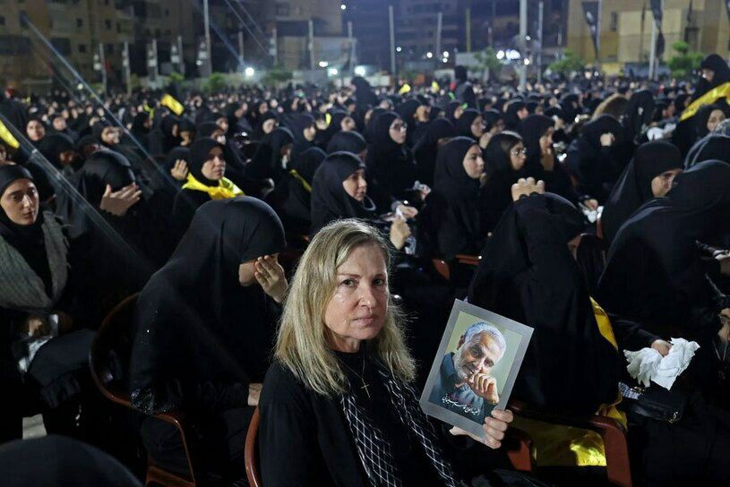 زن مسیحی لبنانی در مراسم عزاداری محرم در منطقه شیعه نشین ضاحیه جنوبی بیروت با در دست گرفتن عکسی از شهید سپهبد حاج قاسم سلیمانی شرکت کرده است./