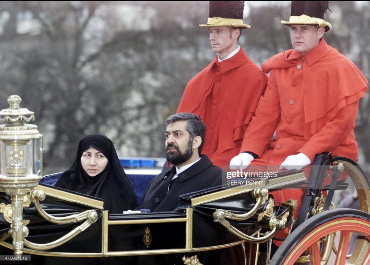 سال ١٣٧٩/ مرتضی سرمدی سفیر جمهوری اسلامی در بریتانیا و همسرش، سوار بر کالسکه سلطنتی برای تقدیم استوارنامه به ملکه الیزابت دوم به کاخ با کینگهام میروند.