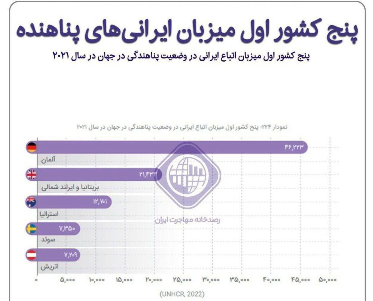 🔹طبق آمار رصدخانه مهاجرت ایران در سال ۲۰۲۱ تقریبا ۱۰۰ هزار ایرانی به اروپا پناهنده شدند که تقریبا نیمی از این میزان کشور آلمان را برای مهاجرت انتخاب کردند