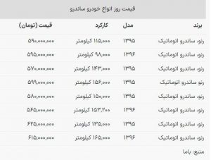 🔹در آگهی های بازار خودرو، رنو ساندرو اتوماتیک مدل ۱۳۹۵ با کارکرد ۱۵۰ هزار کیلومتر ۵۸۰ میلیون تومان قیمت خورده است. همچنین ساندرو مدل ۱۳۹۶ با کارکرد ۱۵۳ هزار و ۲۰۰ کیلومتر، ۵۶۵ میلیون تومان به فروش میرسد.
