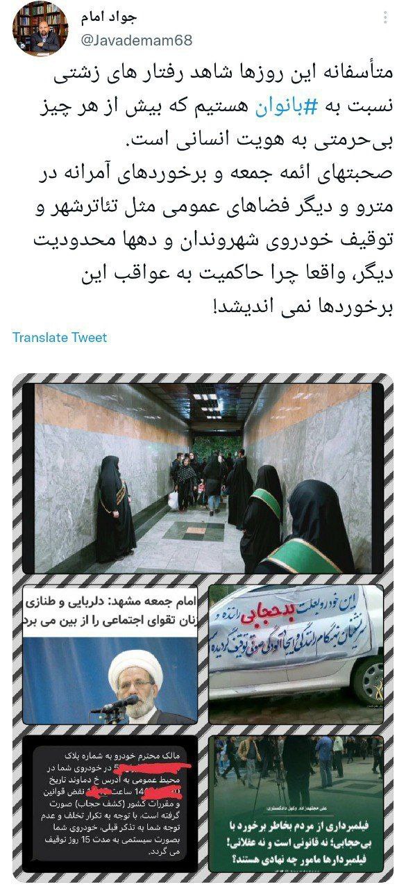 🔹صحبت های ائمه جمعه و برخوردهای آمرانه در مترو و دیگر فضاهای عمومی مثل تئاترشهر و توقیف خودروی شهروندان و دهها محدودیت دیگر، واقعا چرا حاکمیت به عواقب این برخوردها نمی اندیشد!