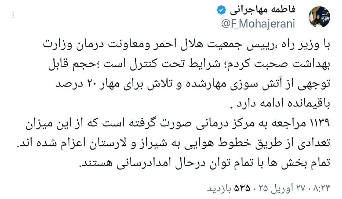حجم قابل توجهی از آتش سوزی مهارشده و تلاش برای مهار ۲۰ درصد باقیمانده ادامه دارد. ۱۱۳۹ مراجعه به مرکز درمانی صورت گرفته است که از این میزان تعدادی از طریق خطوط هوایی به شیراز و لارستان اعزام شده اند