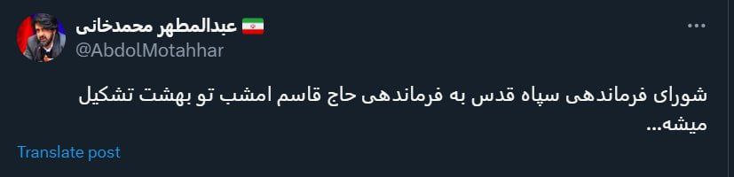 سخنگوی شهرداری تهران: شورای فرماندهی سپاه قدس به فرماندهی حاج قاسم امشب تو بهشت تشکیل میشه…