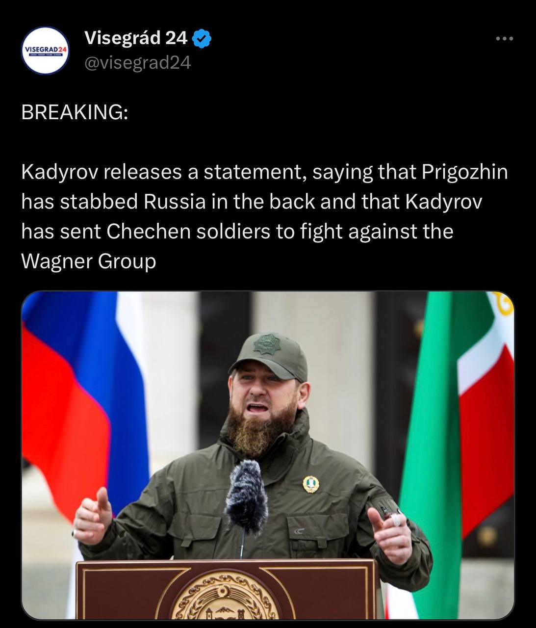 رمضان قدیروف، رئیسجمهور چچن با صدور بیانیهای اعلام کرد: پریگوژین از پشت به روسیه خنجر زده. سربازان چچنی را برای مبارزه با شبه نظامیان واگنر اعزام خواهم کرد.