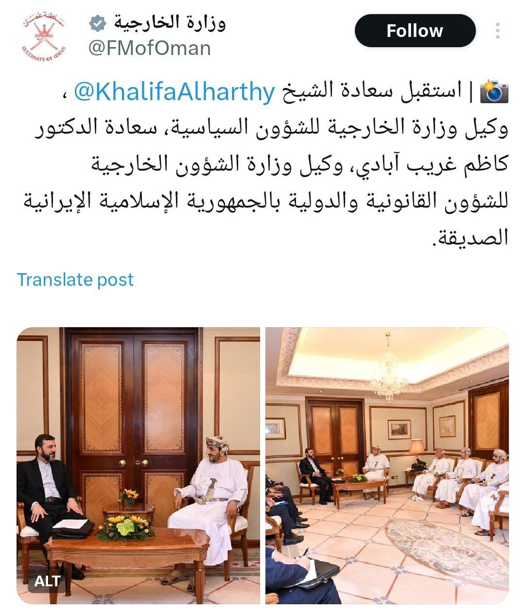 🔹کاظم غریب آبادی، معاون حقوقی و بین الملل وزارت امور خارجه ایران که به مسقط سفر کرده، با شیخ خلیفه علی الحرثی معاون سیاسی وزارت امور خارجه عمان دیدار کرد.