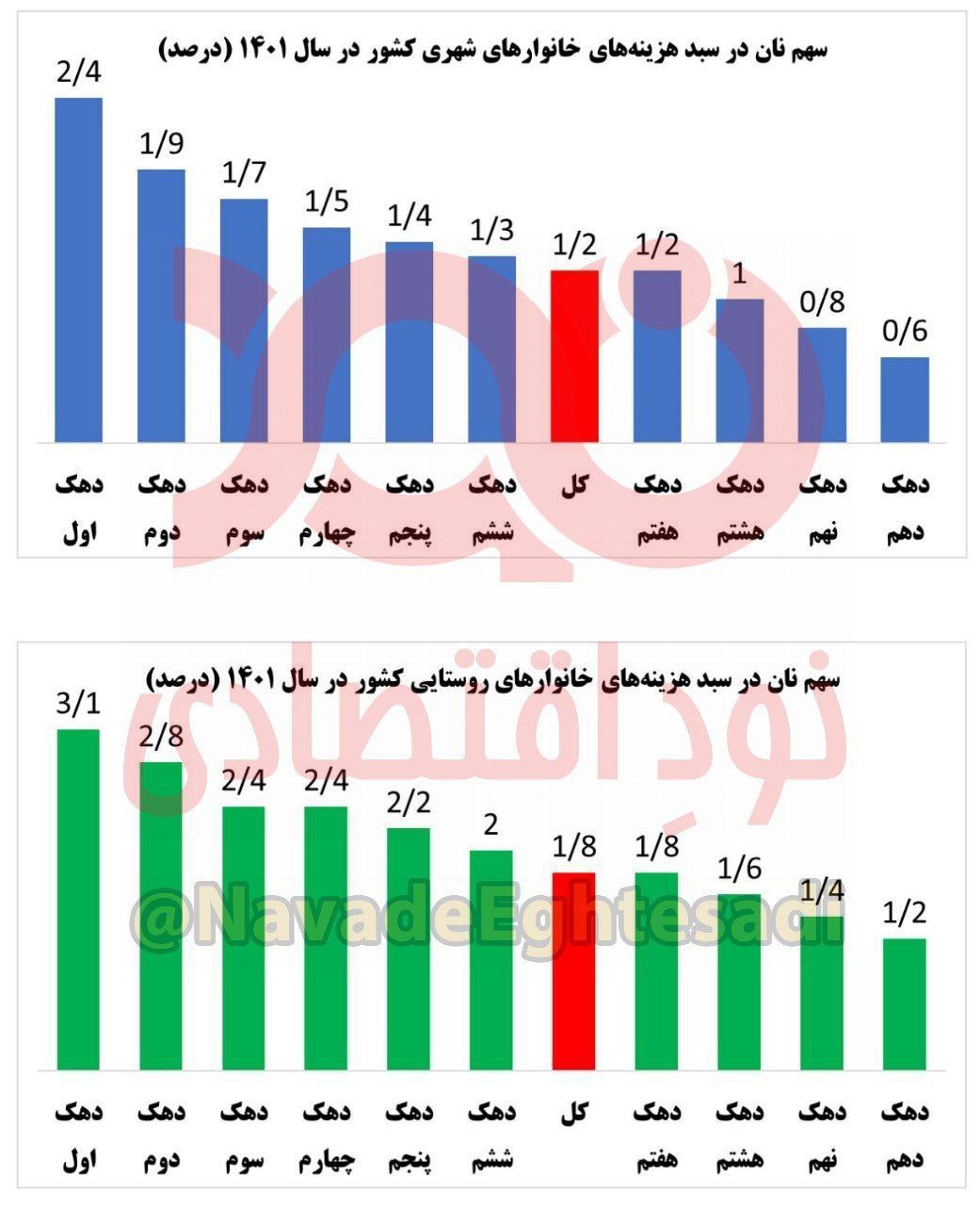 🔹 براساس دادههای هزینه-درآمد مرکز آمار ایران، سهم نان از سبد هزینههای خانوار در مناطق شهری بهطورمیانگین ۱/۲ درصد و در مناطق روستایی ۱/۸ درصد است.