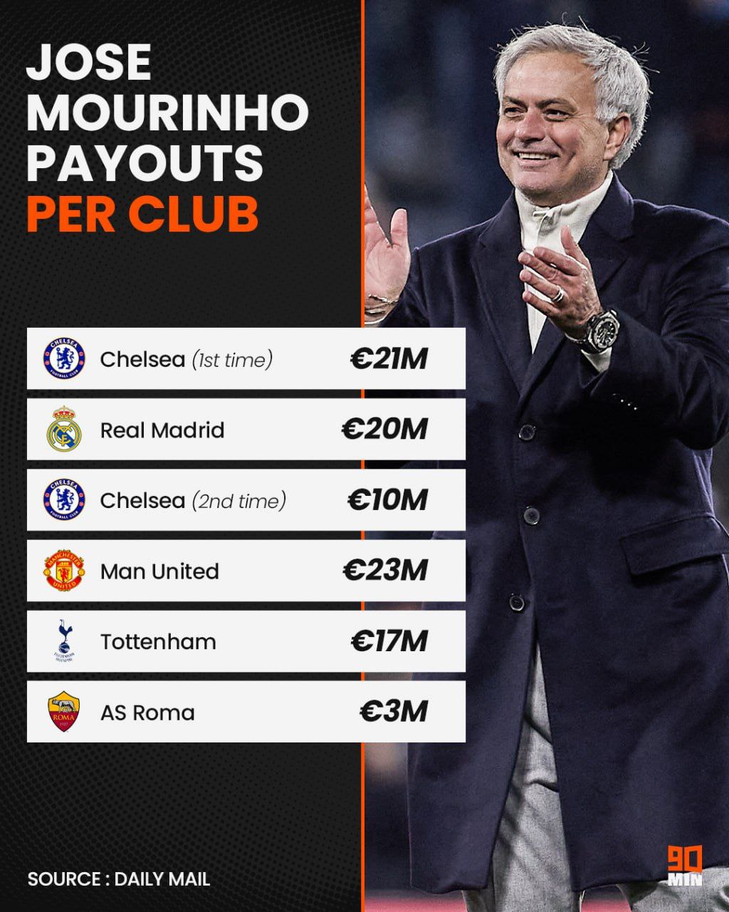 🔹 میزان غرامتی که ژوزه مورینیو بابت شش بار اخراج از باشگاهها طی سالیان اخیر دریافت کرده در حدود ۱۰۰ میلیون یورو است.