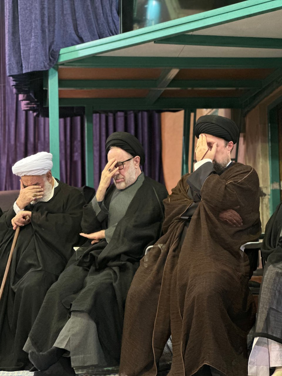 عکسی از سید حسن خمینی، سید محمد خاتمی و محمدی گلپایگانی در مراسم تشییع پیکر آیت الله صانعی مشاهده می کنید