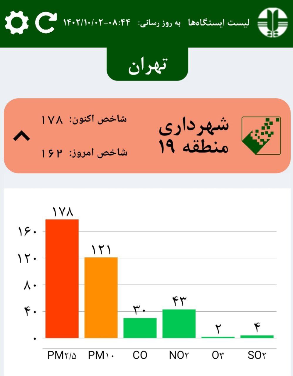 شاخص آلودگی هوای ایستگاه شهرداری منطقه ۱۹ تهران ۱۷۸ است