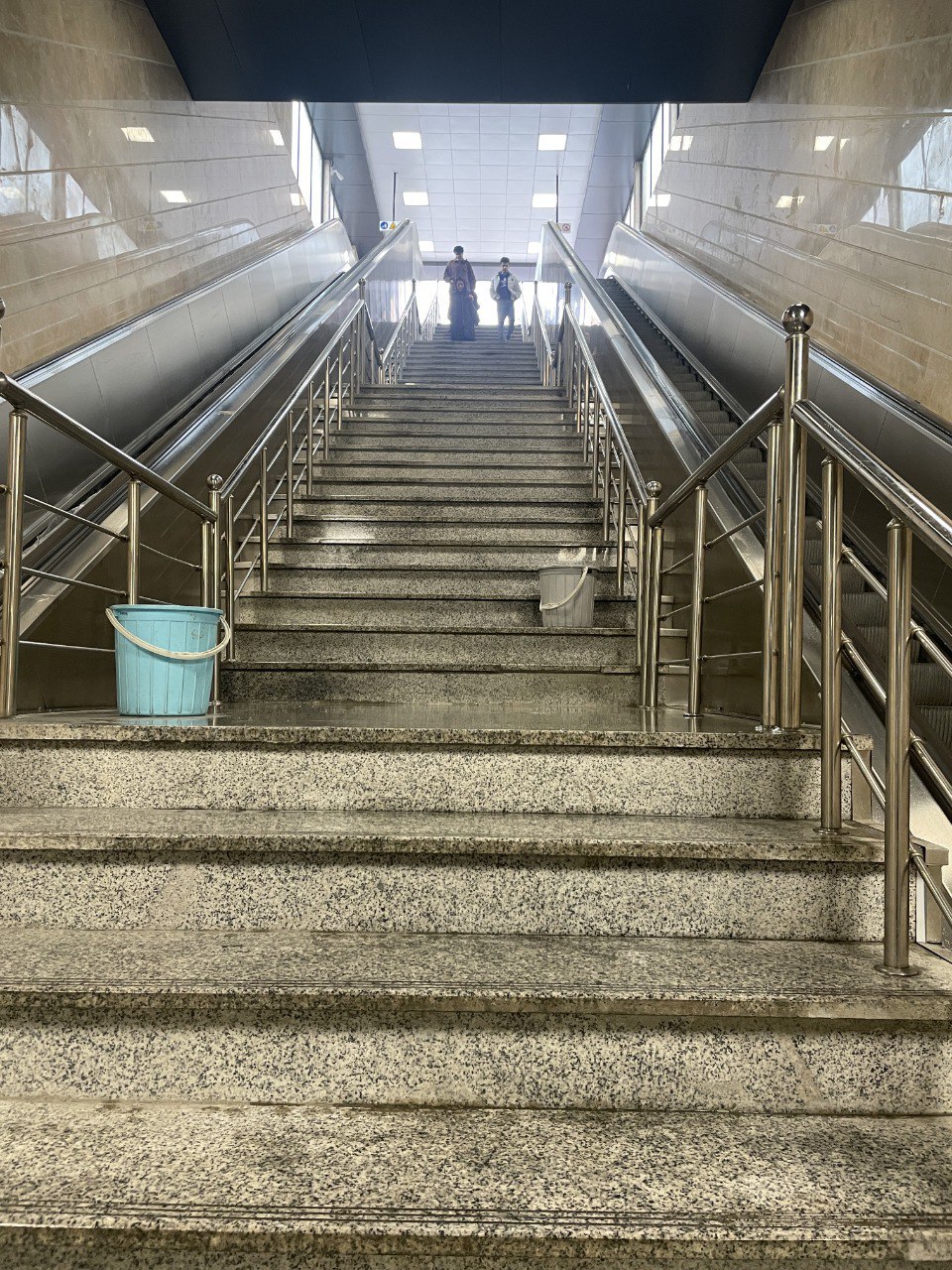 🔹 همانطور که در عکس مشاهده میشود، عوامل ایستگاه متروی شهرزیبا در غرب تهران، سطلهای مخصوص «جمعآوری آب» در پلههای ورودی ایستگاه قرار دادهاند تا آبی که از سقف چکه میکند، جمعآوری شود./