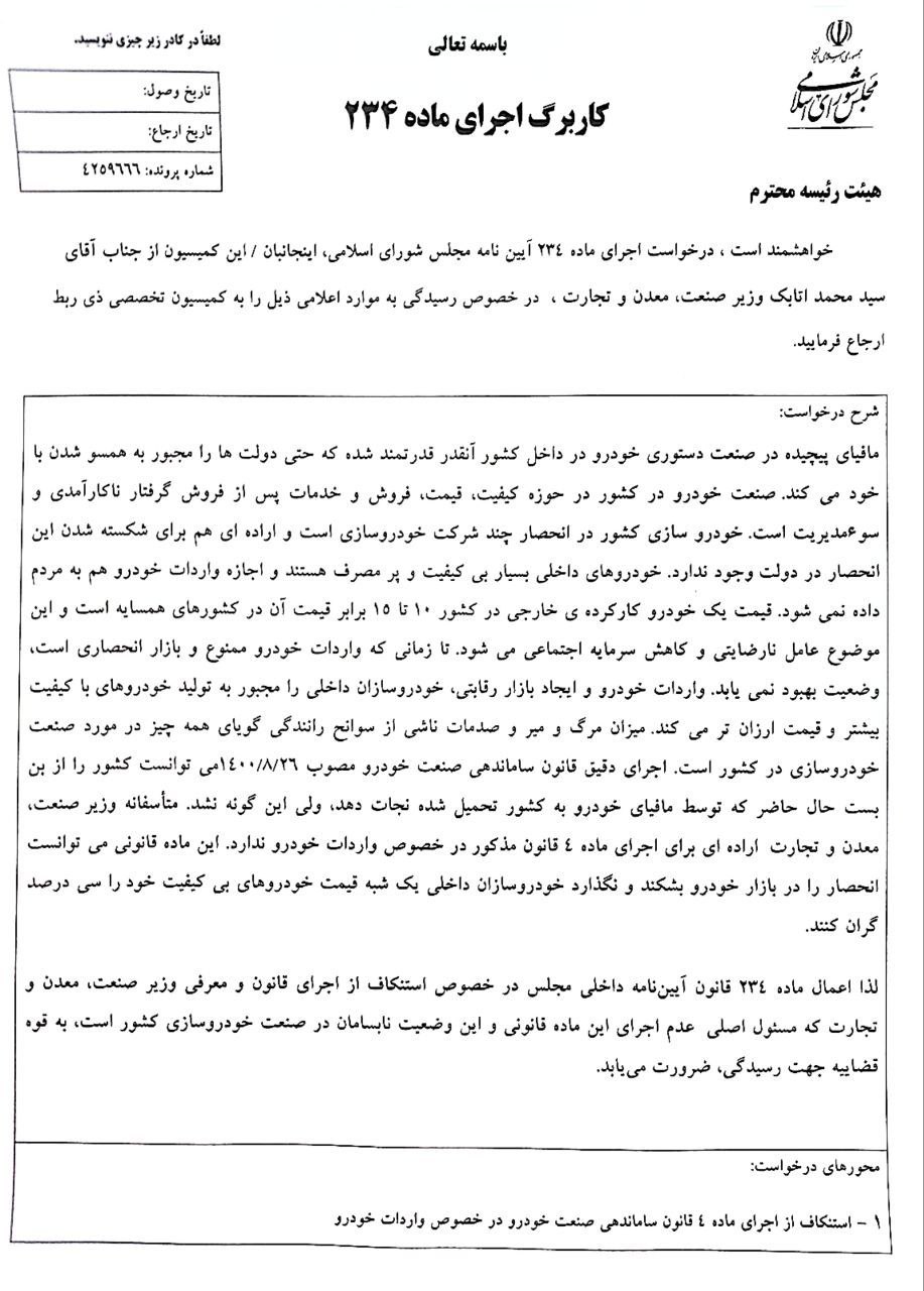 🔹به استناد مجوز ماده ۲۳۴ قانون آیین نامه داخلی مجلس شورای اسلامی، در صورت تایید کمیسیون تخصصی ذیربط، گزارش این شکایت به قوه قضائیه جهت رسیدگی ارجاع می گردد.