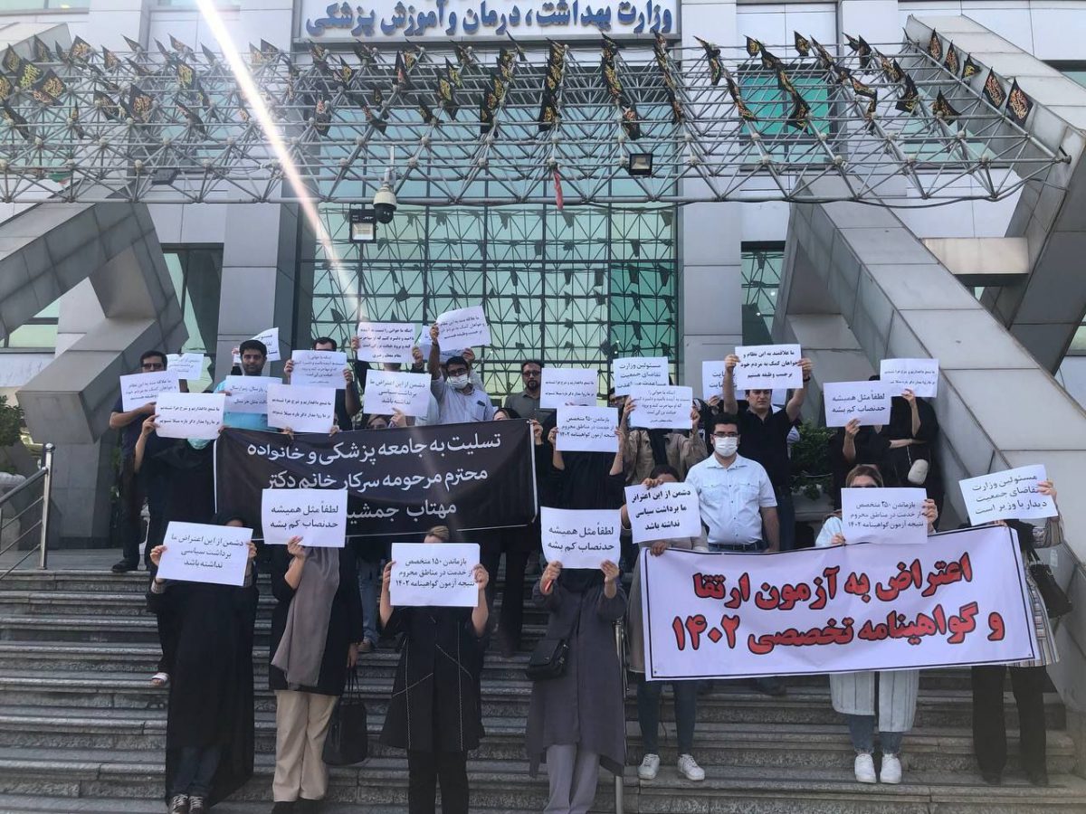 صبح امروز، تجمع اعتراضی دستیاران پزشکی شرکت کننده در ازمون گواهینامه تخصصی ۱۴۰۲ در مقابل وزارت بهداشت