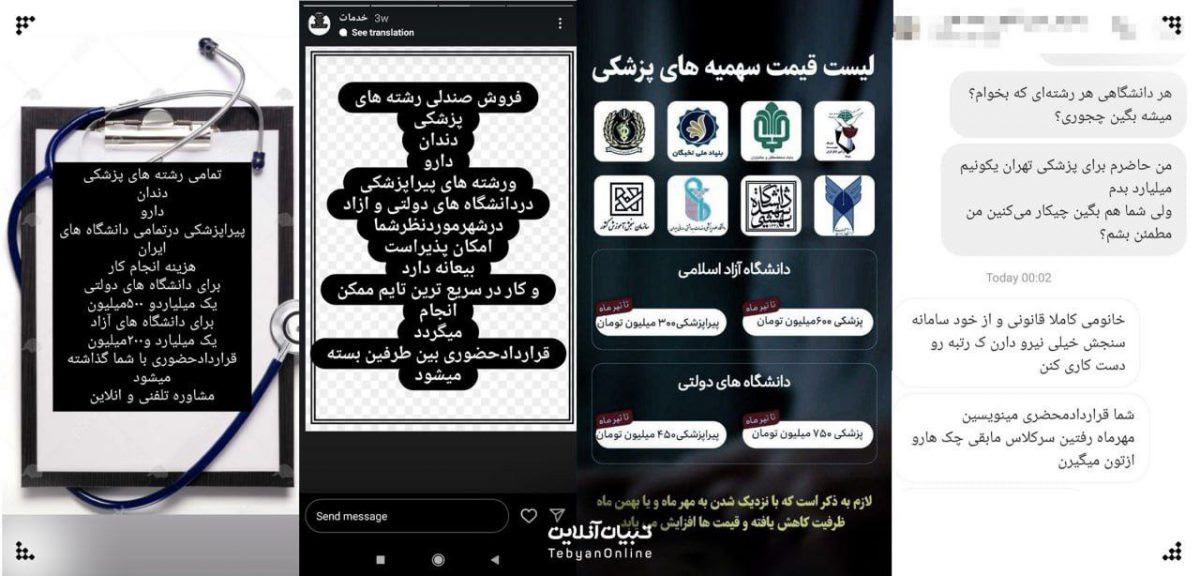 🔹 این موسسهها توضیح میدهند که قیمت صندلیها، نرخ ثابتی ندارد و بر اساس سهمیه، نوع رشته و دانشگاه فرق میکند. مثلا صندلی پزشکی در دانشگاه آزاد ۶۰۰ میلیون و در دانشگاه دولتی با قیمت ۷۵۰ میلیون تومان به فروش میرسد و رشتههای پیراپزشکی در دانشگاه آزاد ۳۰۰ میلیون و دولتی، ۴۵۰ میلیون هستند.