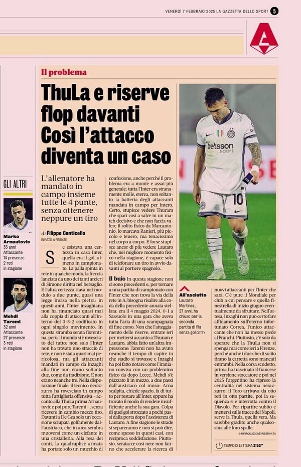 نشریه ایتالیایی با تیتر «تولا و ذخیرههای ناکام» به نقد عملکرد خط حمله اینتر پرداخت چون تولا یعنی تورام و لاوتارو مارتینز زوج همیشگی خط حمله اینتر بسیار بد ظاهر شدند و ورود طارمی و آرناتوویچ و «استفاده 4 مهاجم همزمان مشکل اینزاگی را حل نکرد».بر اساس گزارش گازتا، ارتش 4 تایی اینزاگی(مارتینز، تورام، طارمی و آرناتوویچ) در سردرگمی محض بودند و این زنگ خطری برای اینتر در دفاع از عنوان قهرمانی سریآ است.