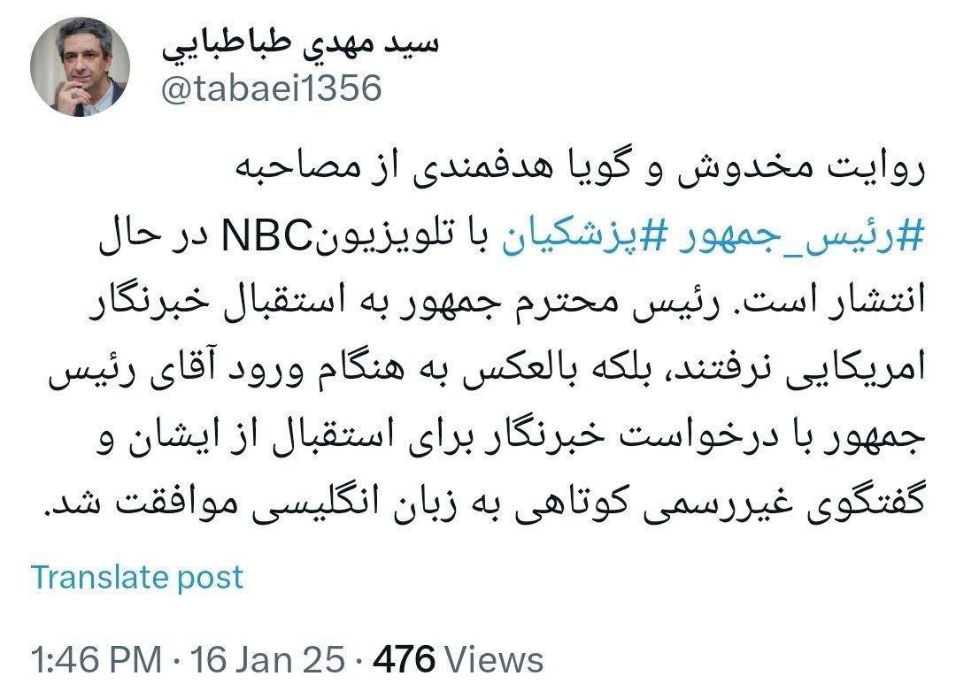 🔹روایت مخدوش و گویا هدفمندی از مصاحبه رئیس جمهور پزشکیان با تلویزیون NBC در حال انتشار است.