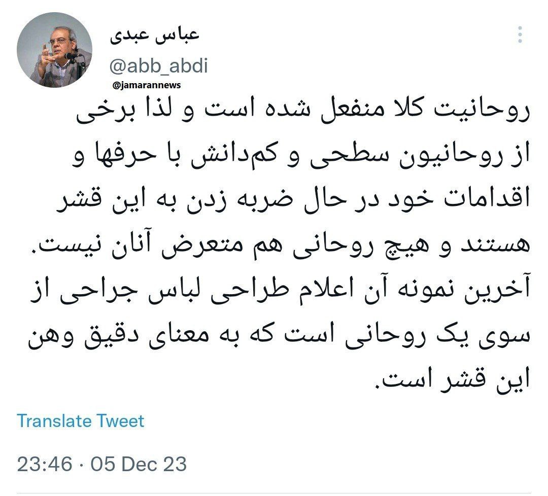 🔹روحانیت کلا منفعل شده است و لذا برخی از روحانیون سطحی و کمدانش با حرفها و اقدامات خود در حال ضربه زدن به این قشر هستند و هیچ روحانی هم متعرض آنان نیست. آخرین نمونه آن اعلام طراحی لباس جراحی از سوی یک روحانی است که به معنای دقیق وهن این قشر است.