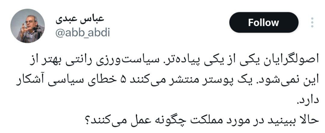 عباس عبدی : 🔹سیاستورزی رانتی بهتر از این نمیشود. یک پوستر منتشر میکنند ۵ خطای سیاسی آشکار دارد.