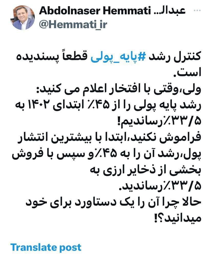 عبدالناصر همتی در شبکه اجتماعی ایکس نوشت: 🔹کنترل رشد پایه پولی ( پول پر قدرت ) قطعاً یک امر پسندیده ای است.