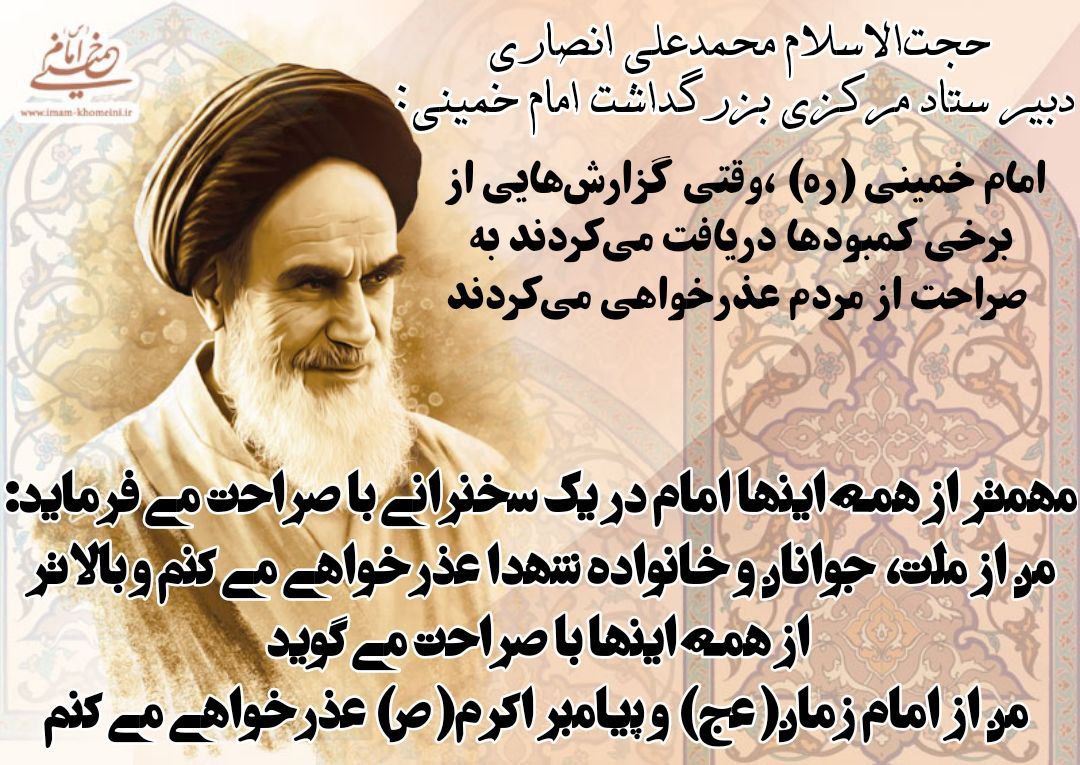 عذرخواهی امام خمینی ره از مردم و امام زمان (عج) به خاطر کمبودها/امام خمینی (ره) ،وقتی گزارشهایی از برخی کمبودها دریافت میکردند به صراحت از مردم عذرخواهی میکردند
