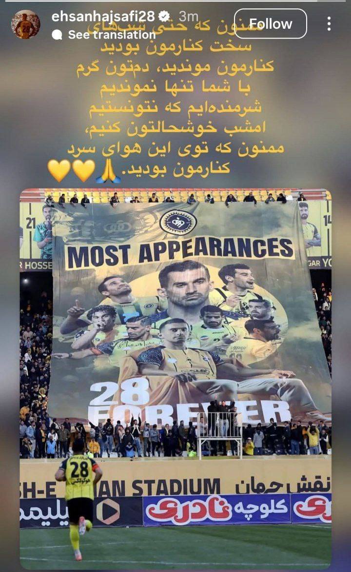 احسان حاجصفی، پس از حذف در جام حذفی با انتشار استوری از هواداران سپاهان عذرخواهی کرد.
